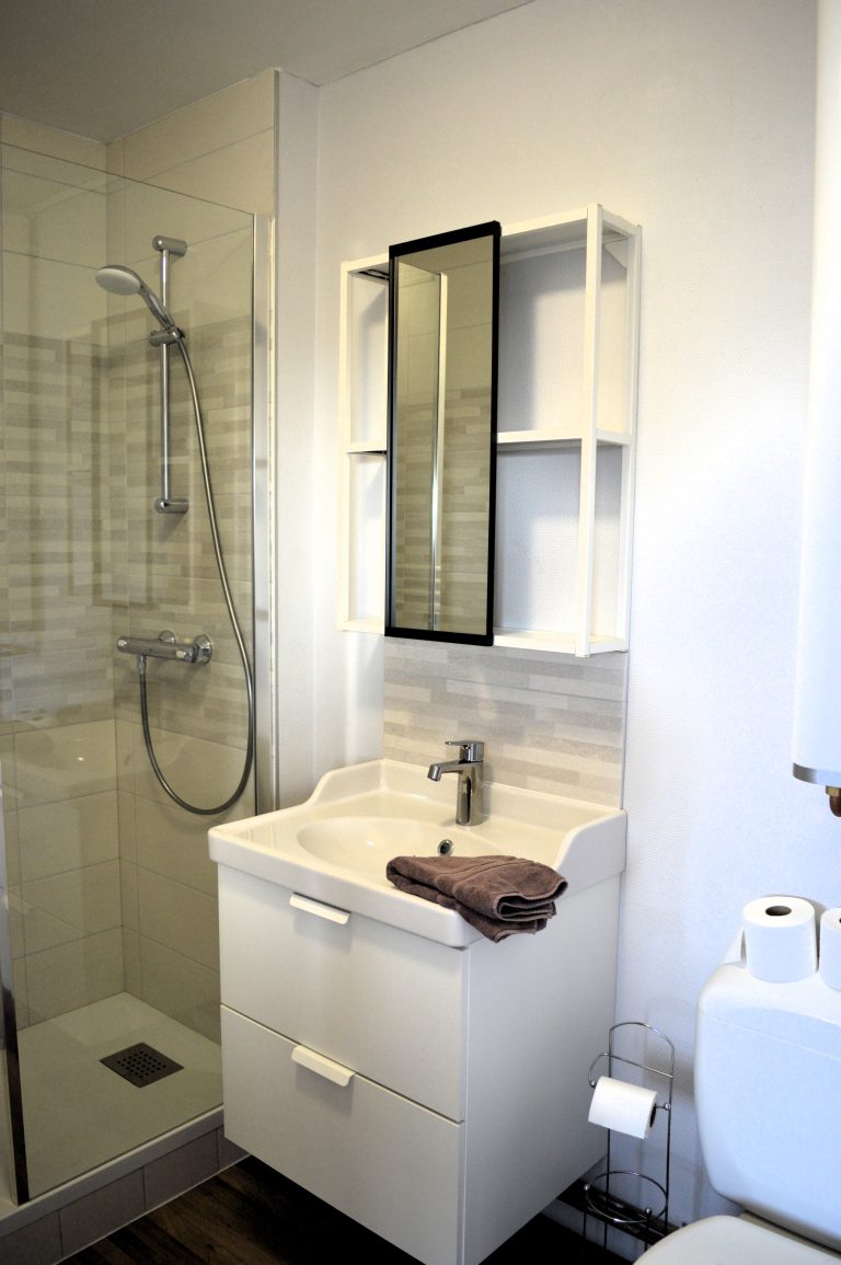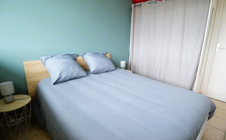 Une chambre avec un lit double qui donne accès à la salle de douche avec WC.