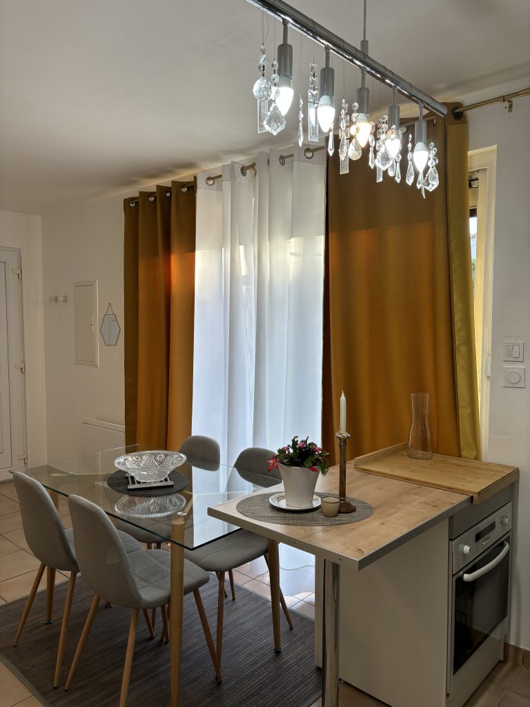 La salle à manger, avec une table pour 4 personnes, devient le lieu idéal pour savourer des repas délicieux ou pour travailler avec une connexion fibre. La cuisine moderne est équipée de tout le nécessaire pour faciliter votre séjour. La grande baie vitrée laisse entrer une belle lumière naturelle, et n’oubliez pas, elle ne s’ouvre que du côté de l’entrée, offrant une vue agréable sur la terrasse bordée d’une grande haie. Actuellement, des travaux de jardinage sont en cours, incluant la plantation de nouvelles fleurs et de plantes. Ces aménagements seront achevés d’ici mars, transformant l’espace extérieur en un lieu enchanteur. Des cabanes sont disponibles pour le stockage de vos vélos. Le store est électrique et offre un contrôle pratique de la luminosité.