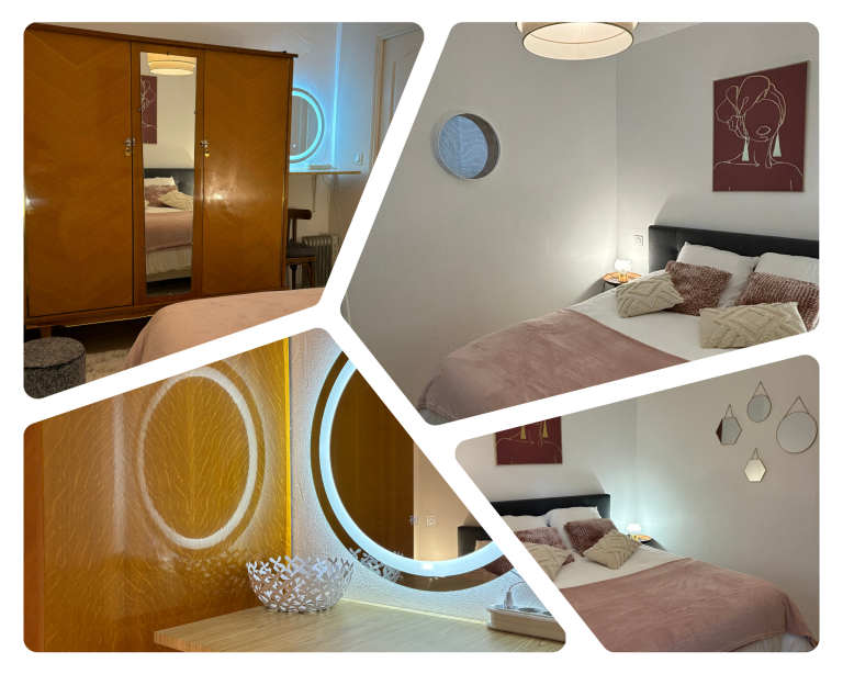 Dans la chambre, découvrez le confort d’un lit double et l’espace pratique d’une grande armoire équipée de cintres et d’étagères. Vous y trouverez également un fer à repasser et une table à repasser pour votre commodité. Bienvenue dans un espace où confort, fonctionnalité et esthétique se rencontrent harmonieusement.