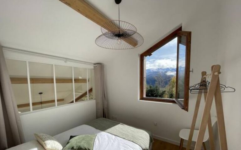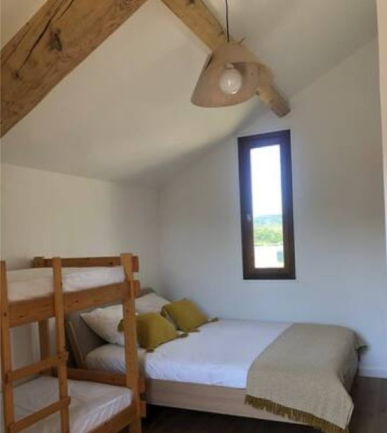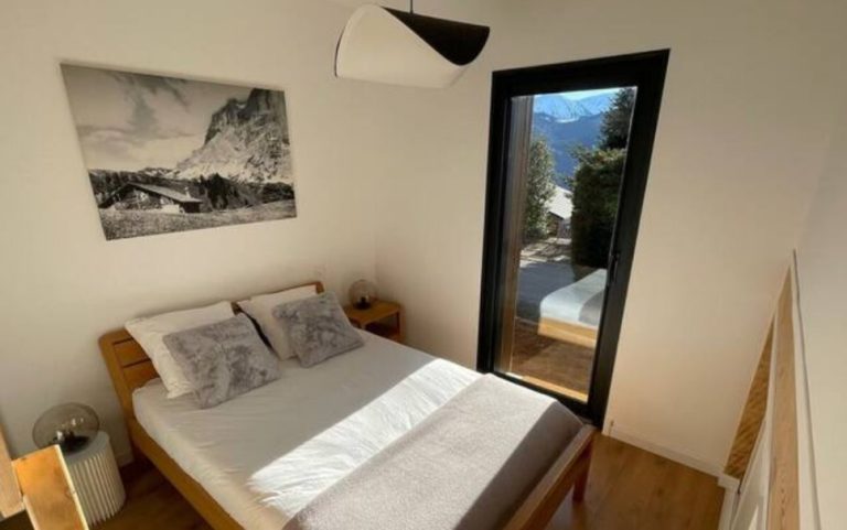 L’étage supérieur abrite deux chambres supplémentaires, augmentant la capacité d’accueil du chalet. L’une est aménagée avec un lit double classique, tandis que l’autre propose une configuration unique avec un lit double et un lit mezzanine composé de deux matelas de 90 cm, idéal pour les enfants ou les invités supplémentaires. Un espace cosy avec un lit convertible en 80 ou 160 cm offre une flexibilité supplémentaire pour accueillir des visiteurs ou créer un coin lecture tranquille.