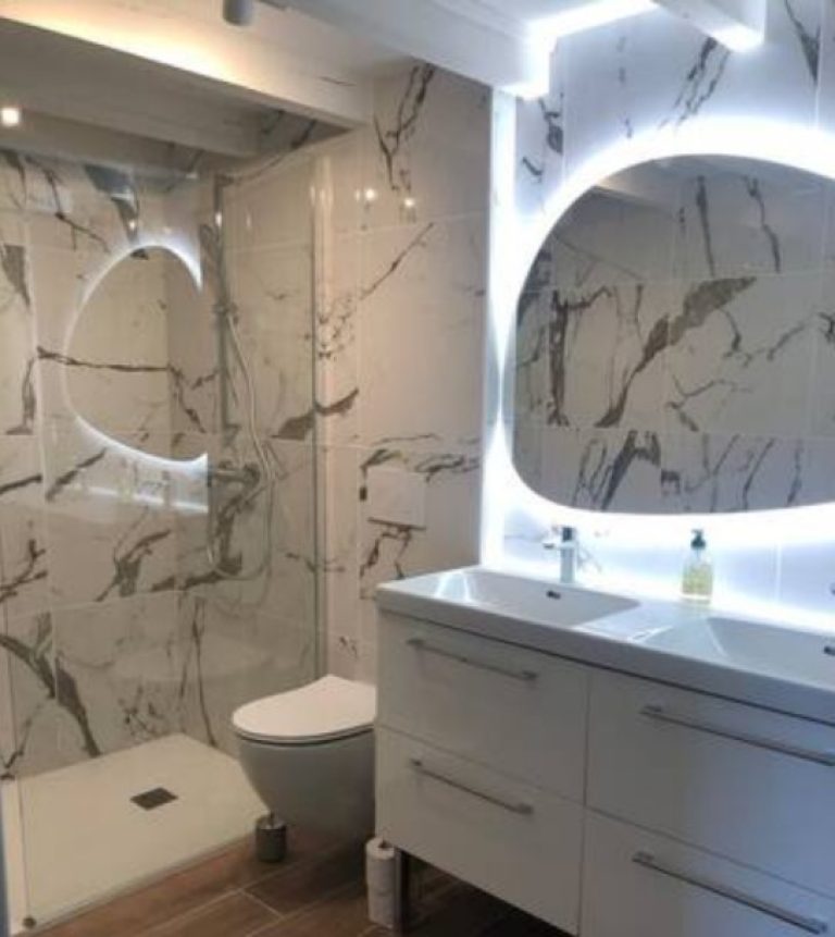 L’entrée du chalet s’ouvre sur une grande salle accueillante avec un canapé confortable face à une télévision connectée, idéale pour se détendre après une journée de ski. À côté, une salle d’eau pratique équipée d’un lave-linge et de toilettes offre commodité et fonctionnalité.