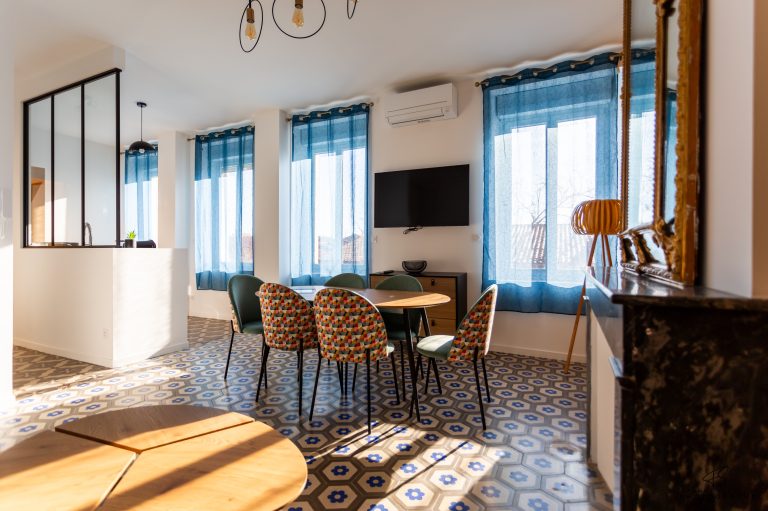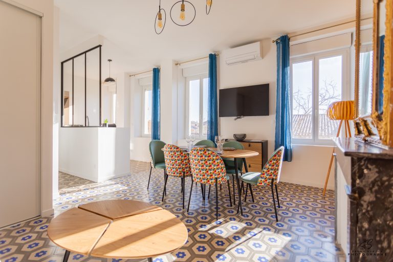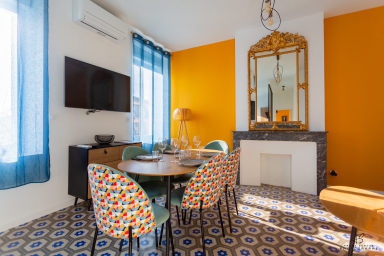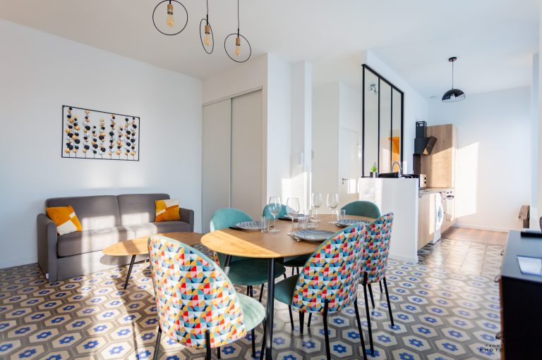– Un coin repas avec une table à manger avec chaises ajustables