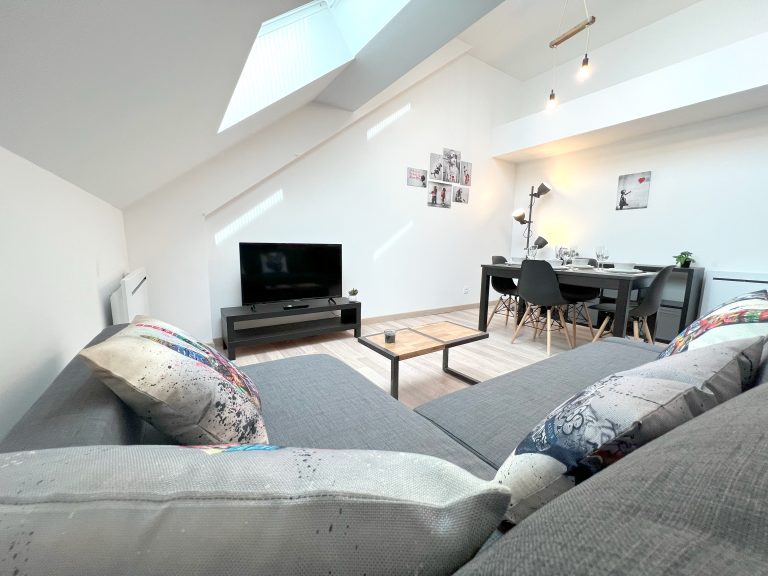 Notre appartement cozy de 50m2 est idéal pour une virée en amoureux, un séjour en famille ou un week-end entre amis. Vous apprécierez le grand salon à la déco street art ouvert sur une cuisine intégrée full option. Côté salon, un grand canapé convertible, une table avec rallonge, une TV full HD avec chaînes TNT et Netflix, vous permettent de passer des moments détente et conviviaux.