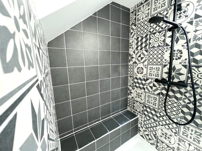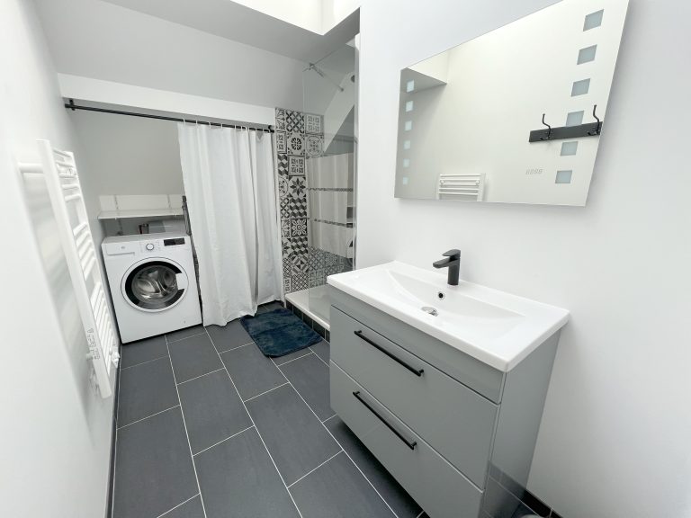 Enfin, la salle de bain, baignée de lumière, bénéficie d’une grande douche et de tout l’équipement nécessaire à l’entretien du linge : lave-linge, étendoir, table et fer à repasser.