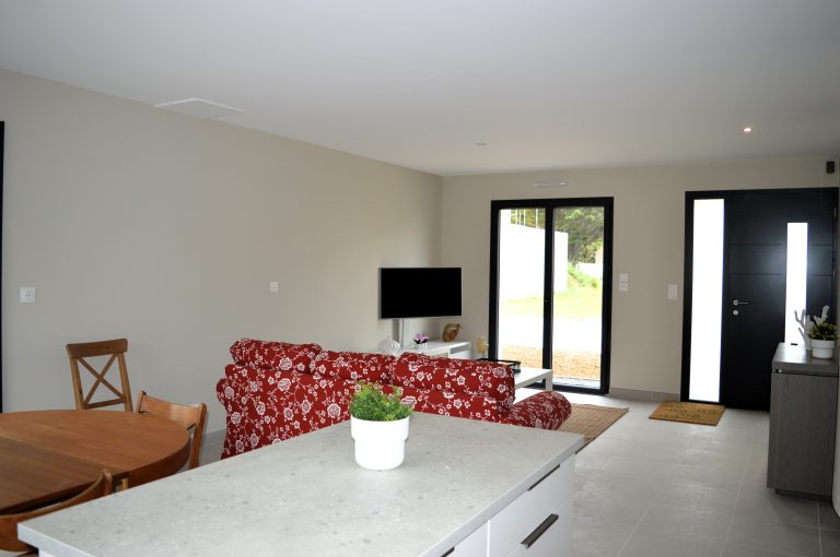 Vous entrerez dans cette maison se situant dans un lotissement neuf où certaines maisons sont encore en construction par la pièce de vie :