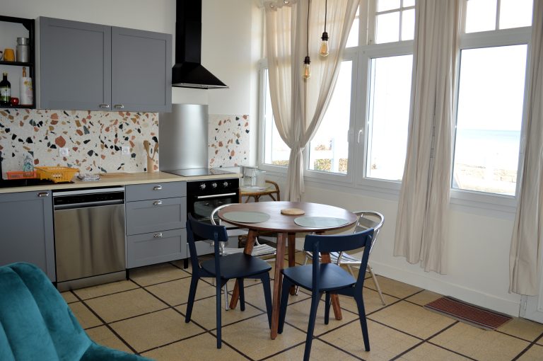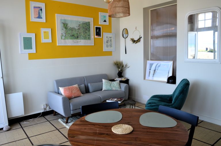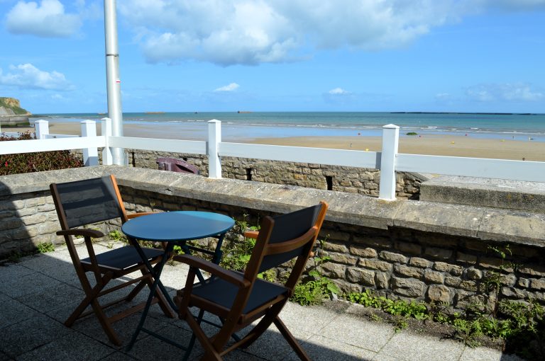 L’appartement se trouve sur la digue avec une imprenable vue sur le ponton 449 et la plage d’Arromanches.