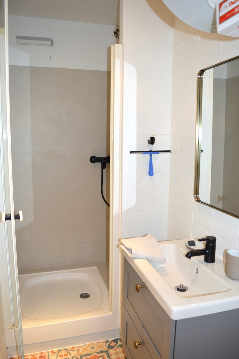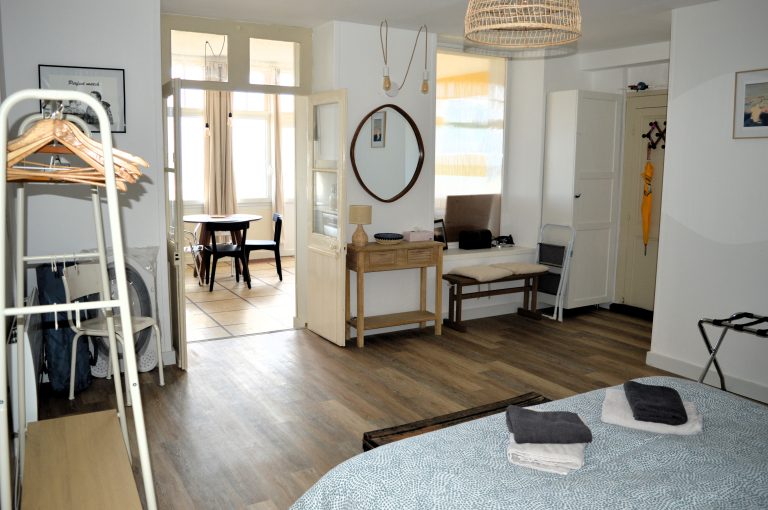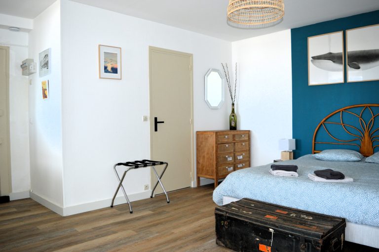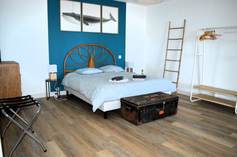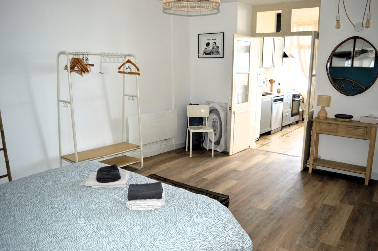 Vous entrerez dans le logement par la grande chambre avec un lit double en 160cm et accès à la salle de douche avec WC.