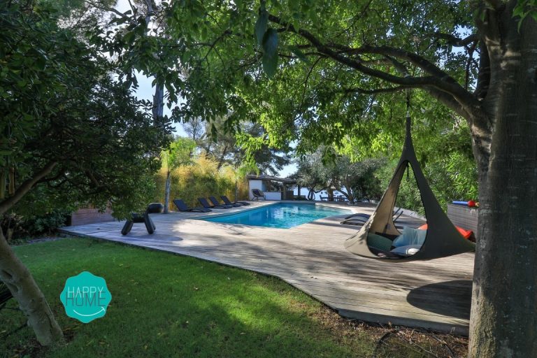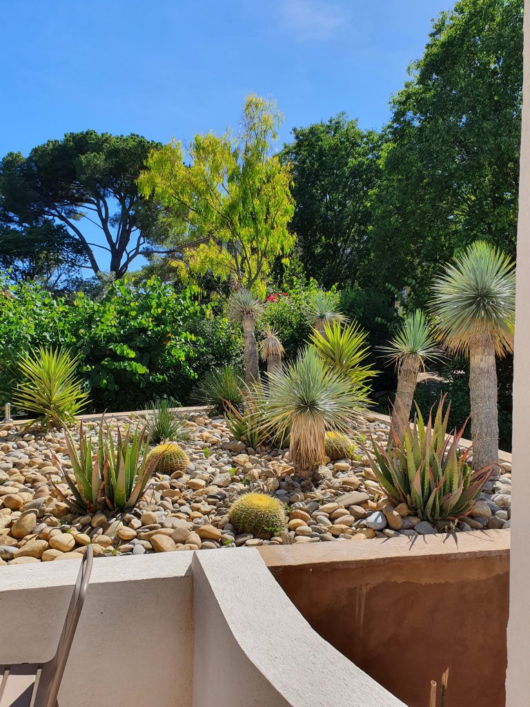 Dès les premières marches en pierre de Borme, les grillons se font entendre. Ce jardin est tout en longueur, vous y croiserez un terrain de pétanque et une piscine à la forme originale (elle a été construite par son ancien propriétaire il y a 30 ans à la dynamite). Une très belle plage aménagée accueille un arbre micocoulier qui offre ombre ou soleil à votre guise. Du vert, du bleu, du grisé… une explosion de couleur.