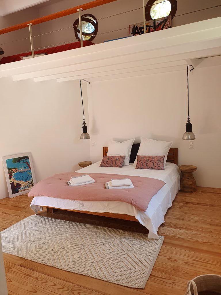 Quelques marches plus bas un petit peu à l’écart, une chambre en suite avec sa salle de bain et ses WC accueille un couple (lit double en 160) et bénéficie d’un accès extérieur.