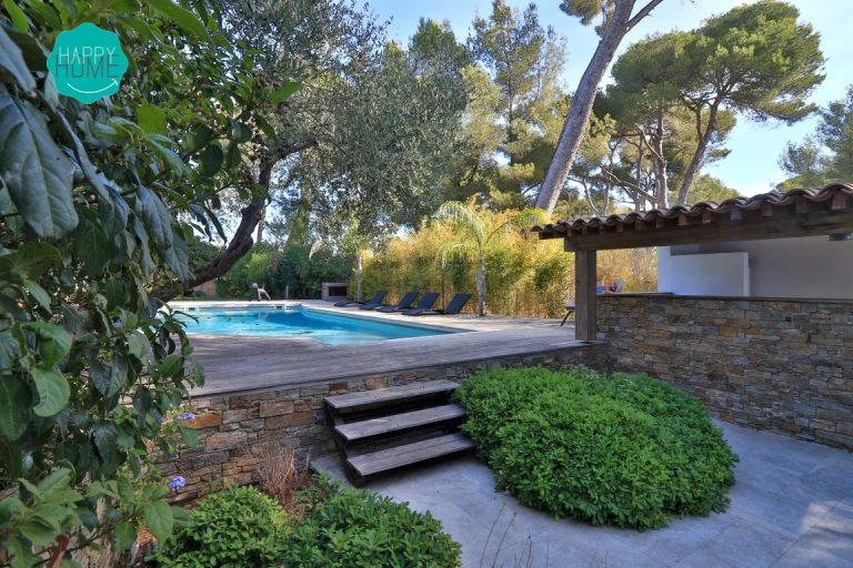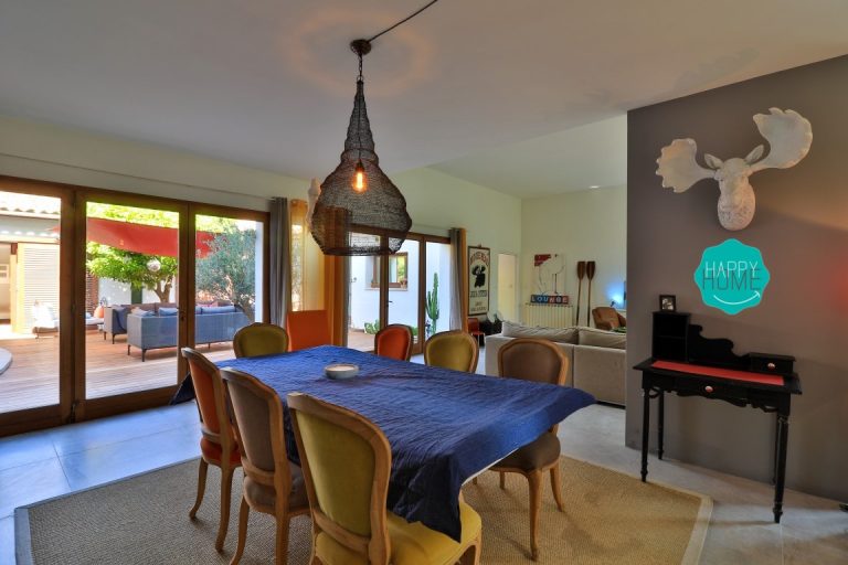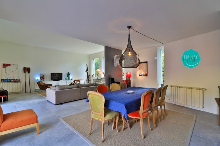 Elle se compose au RDC d’une grande entrée, d’un très beau séjour cathédral en suite avec la salle à manger, tous deux ouverts sur le patio. De belles et grandes baies vitrées illuminent le séjour avec une vue sur la nature et ses pins centenaires.