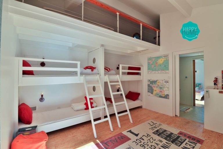 Deux chambres donnent elles aussi sur le patio, elles se partagent une salle de bain et ses toilettes. L’une est un dortoir avec ces deux lits maçonnés superposés offrant 4 couchages en 90 et l’autre est composée d’un grand lit en 180.
