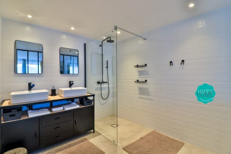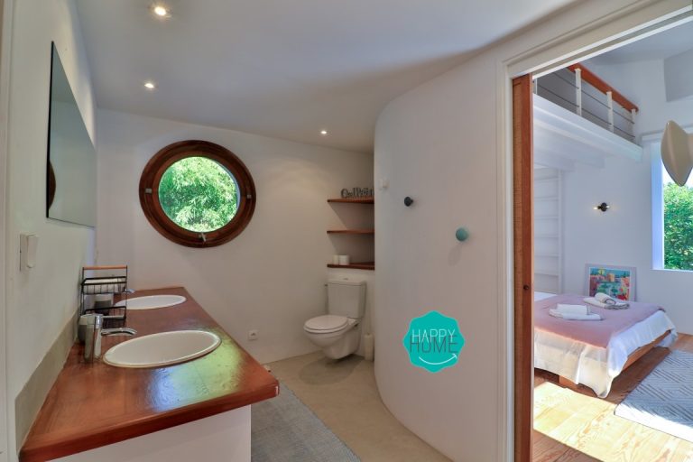 La suite parentale à l’étage est dotée d’une vaste douche et d’un lavabo, elle s’ouvre sur une terrasse privée particulièrement reposante, un observatoire de vie avec une vue plongeante sur le jardin en direction de la mer. Les toilettes sont à part, en bas des escaliers.