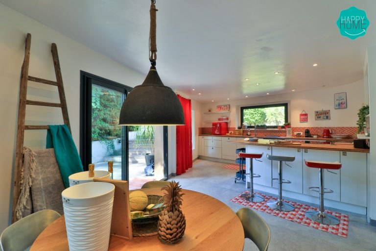Sa cuisine est spacieuse et lumineuse, elle est toute équipée et dispose d’un coin repas. Son accès vers l’extérieur par une grande baie vitrée donne sur une terrasse qui vous invite à commencer la balade vers le jardin.