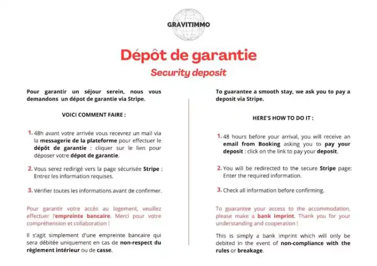 Pour la sécurité de tous, un dépôt de garantie sous forme d’empreinte bancaire de 350€ via le terminal de paiement sécurisé Wannapay vous sera demandé avant votre entrée dans les lieux.
