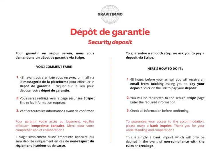 Pour la sécurité de tous, un dépôt de garantie sous forme d’empreinte bancaire de 650 € via le terminal de paiement sécurisé vous sera demandé avant votre entrée dans les lieux.