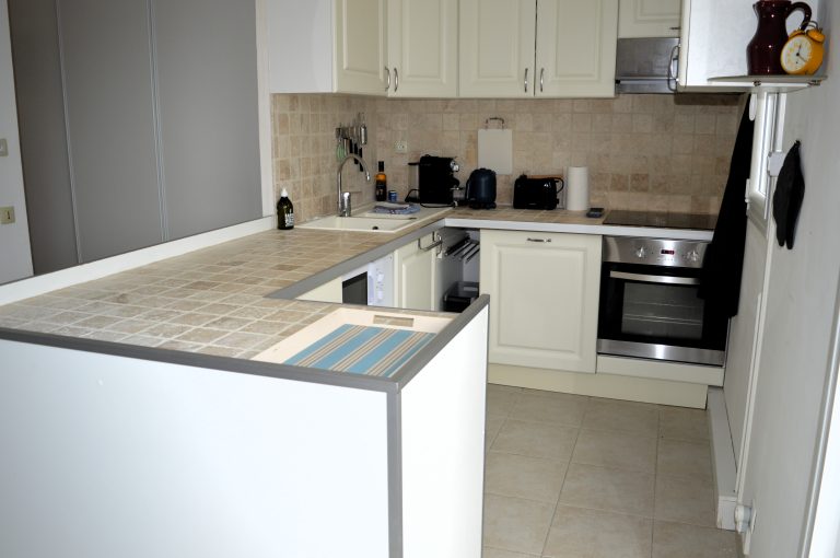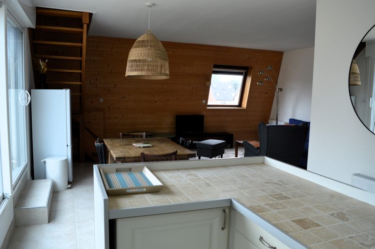 Le logement dispose d’une cuisine équipée ouverte sur l’espace le salon/ salle à manger .