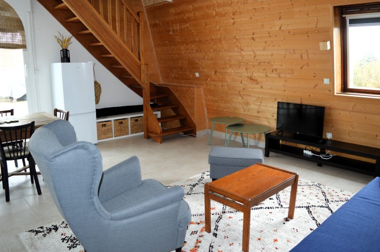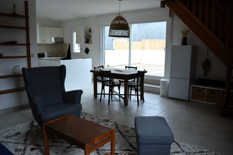Vous entrerez dans le logement avec une première pièce où se trouve les WC séparés et la salle d’eau, ensuite vous accédez a la pièce de vie principale avec la cuisine ouverte, la salle à manger et le salon avec télévision donnant accès à la terrasse.
