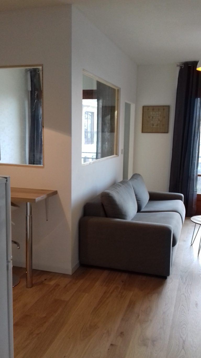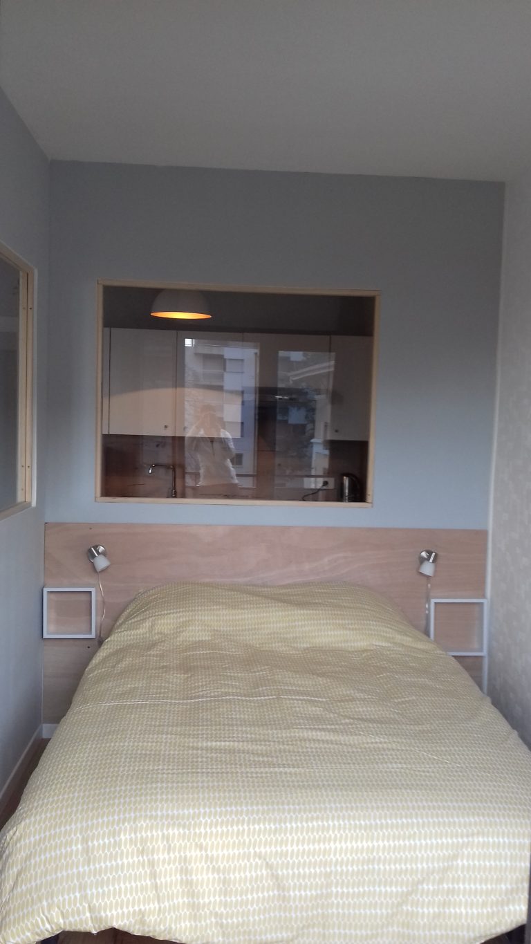 – 1 Coin chambre séparé avec lit de 140cm,bonne literie, table de chevet et lampe, très pratique pour un studio
