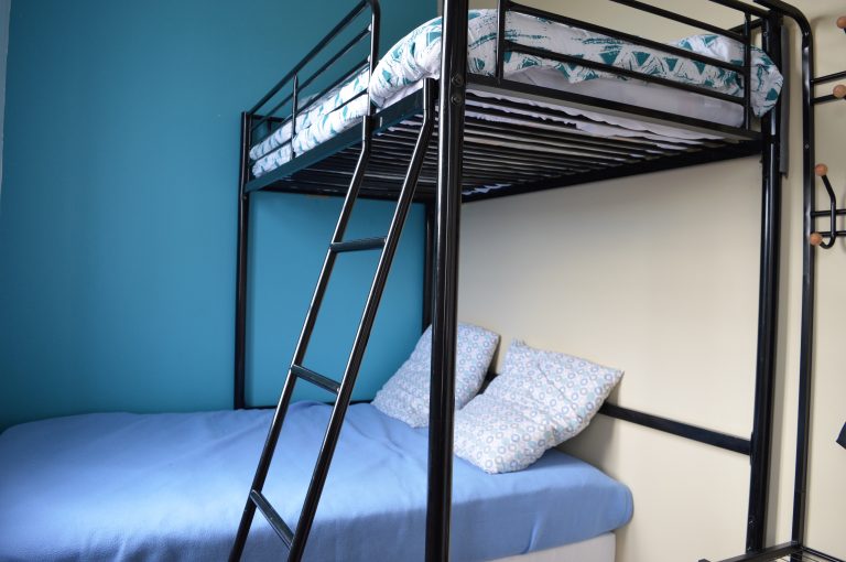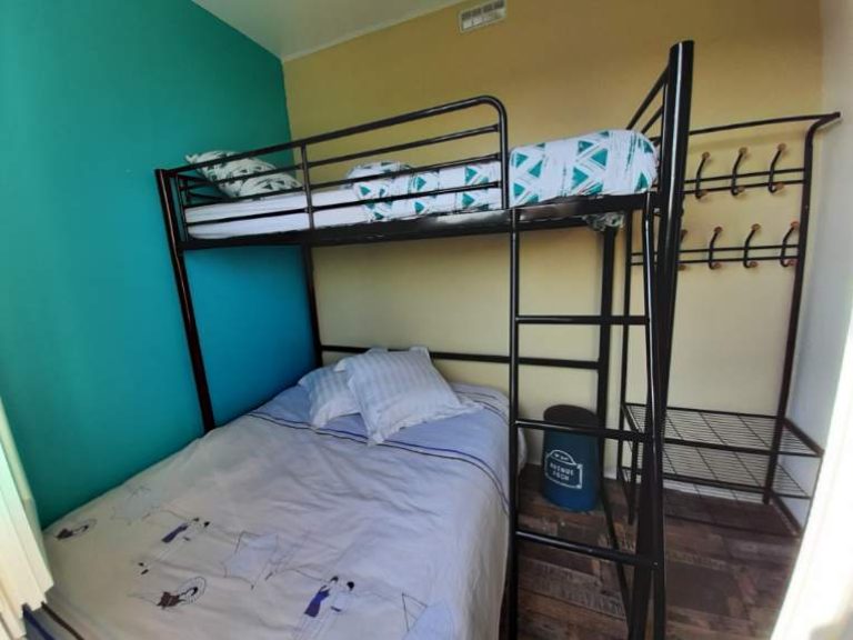 Une deuxième chambre avec un lit double en 140cm et au-dessus un lit simple superposé.