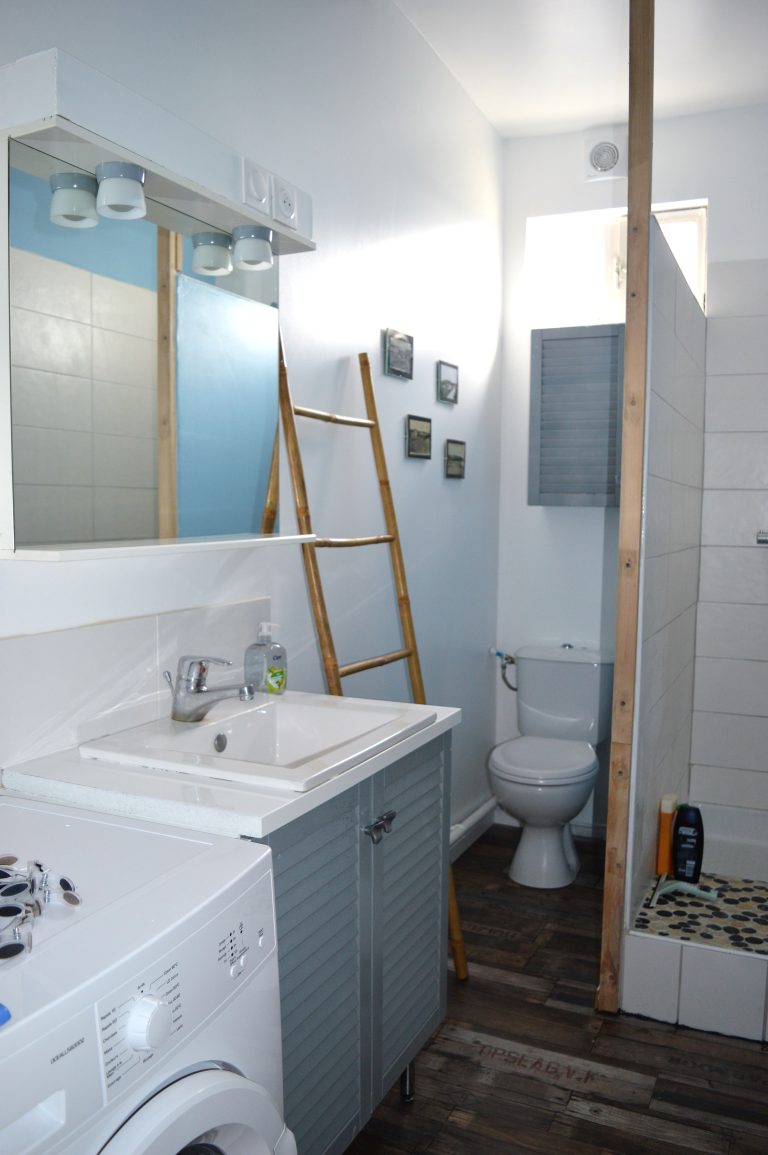 Salle de douche avec WC et machine à laver.