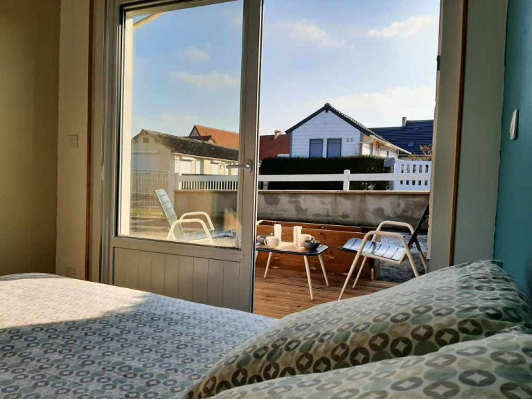 Une chambre avec un lit double et petit coin privatif de la terrasse pour prendre le petit déjeuner le matin. Verrière pour profiter de la lumière traversante de la pièce (et store occultant pour plus d’intimité).