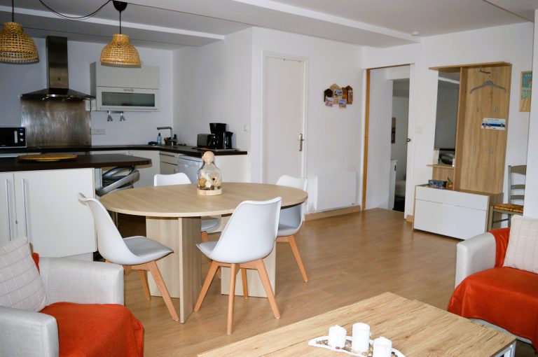 – un coin repas avec une table à manger + bar et 2 chaises hautes