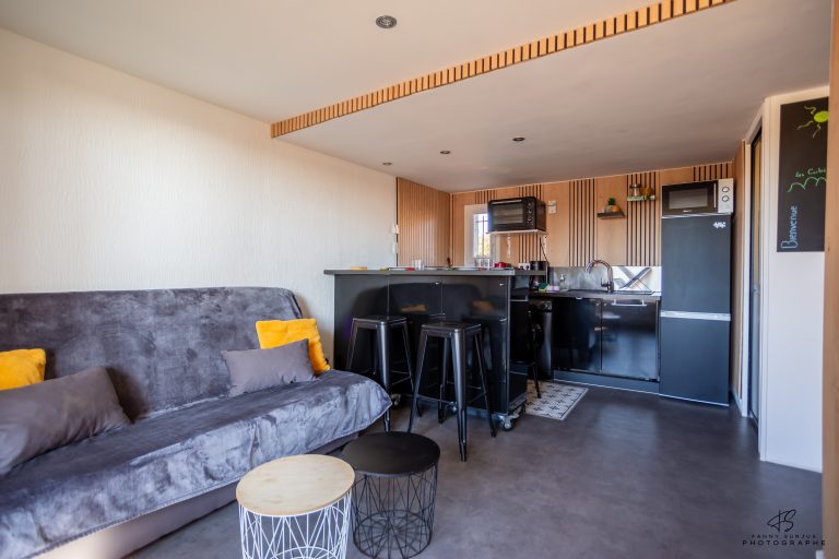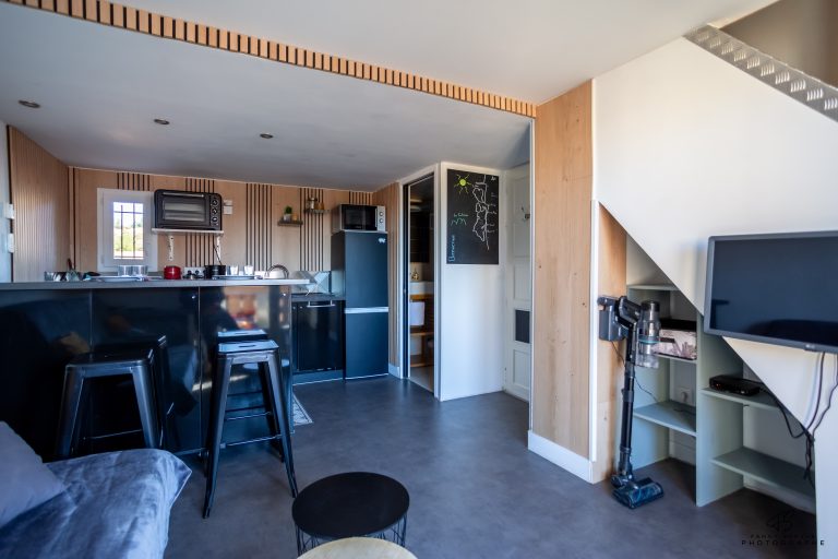 L’appartement « L’Étang » offre un espace agréable et fonctionnel pour votre séjour. La pièce principale comprend une cuisine entièrement équipée avec four, micro-ondes, machine à laver et plus encore.