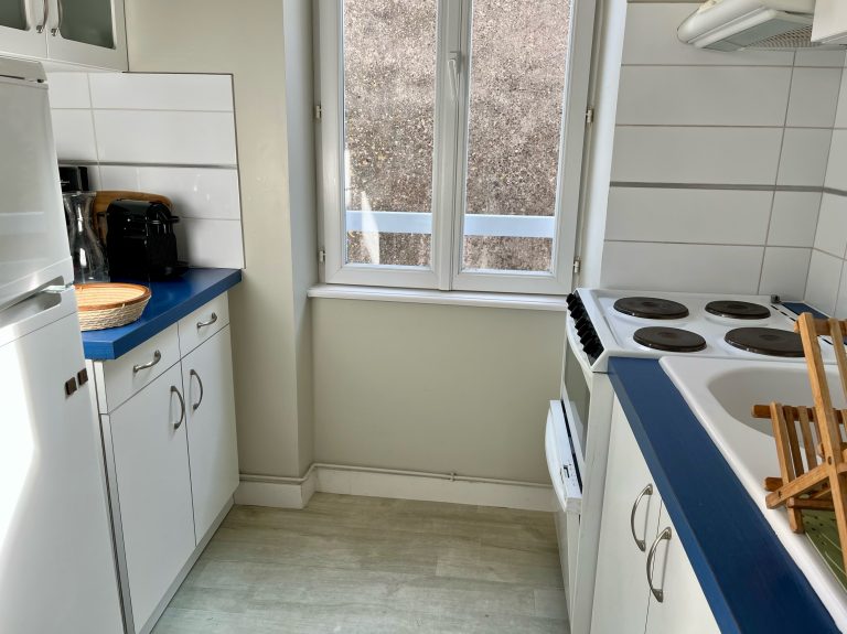Petite cuisine avec plaques de cuisson et four, petit lave vaisselle. Machine à café (nespresso + machine à filtres), grille pain, bouilloire.