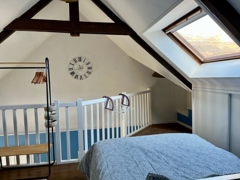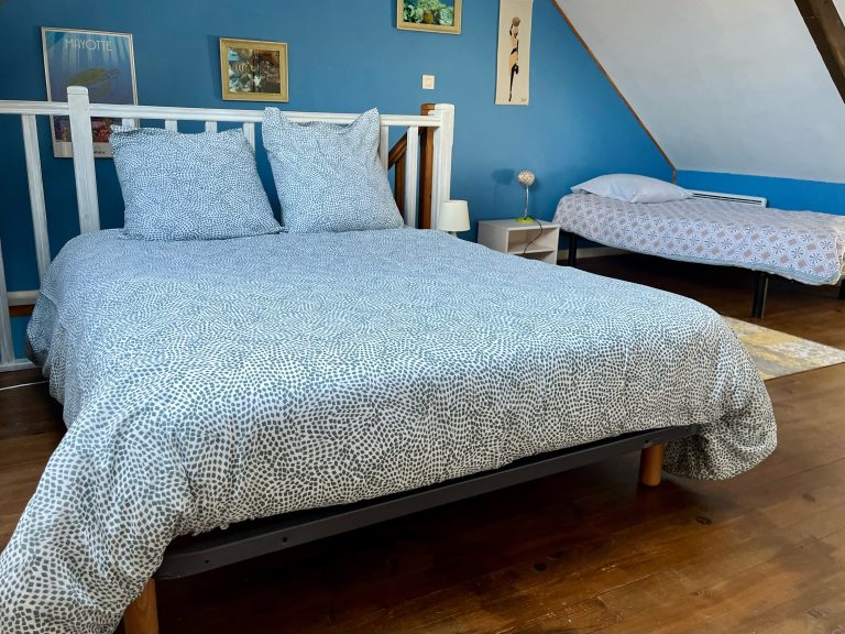 A l’étage en mezzanine chambre avec un lit double en 140cm et un lit simple.