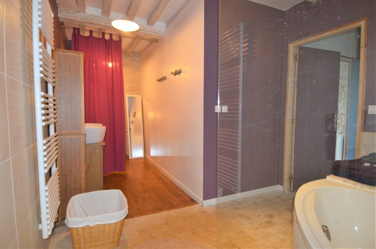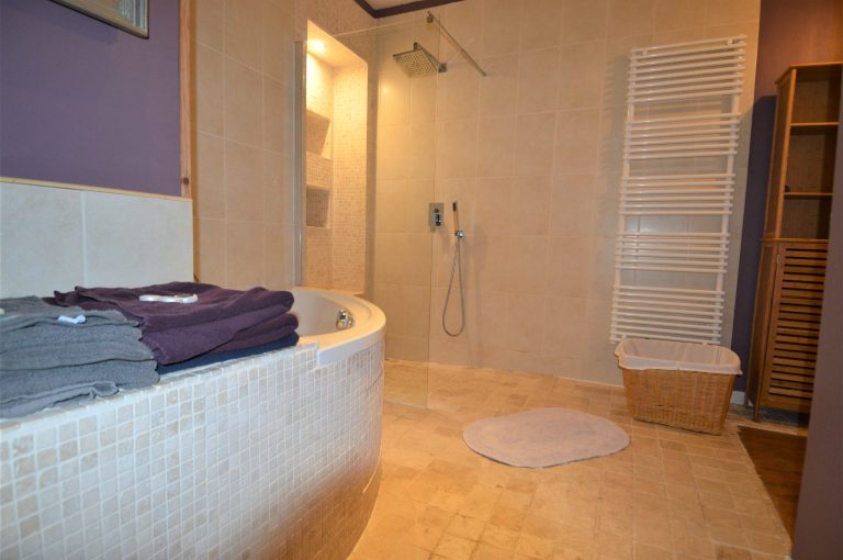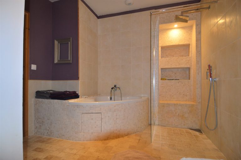 Grande salle de bain avec WC, baignoire d’angle, grande douche à l’italienne et double vasque.