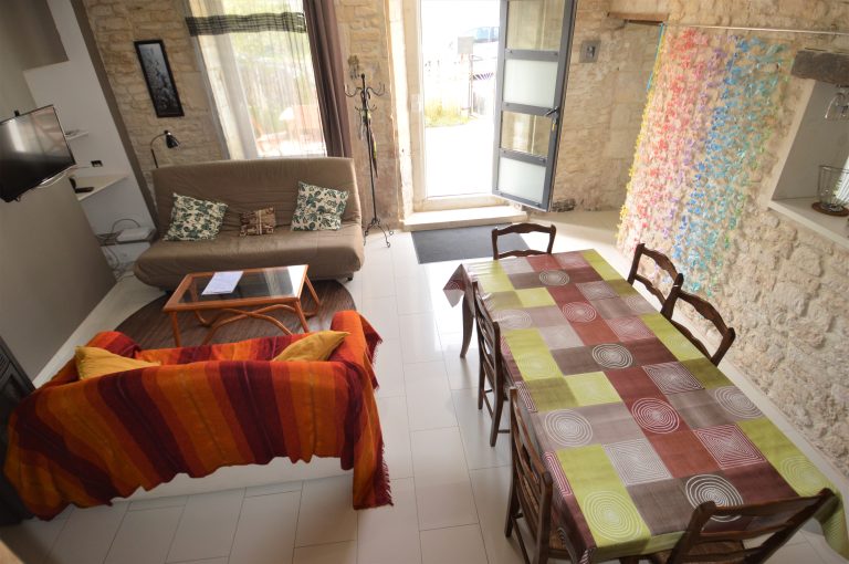 Vous entrerez dans cette jolie maison rénovée par la cour commune de l’ancien prieuré où vous pourrez garer votre voiture. Le jardinet privatif vous permettra de vous relaxer au soleil et de manger à l’extérieur.