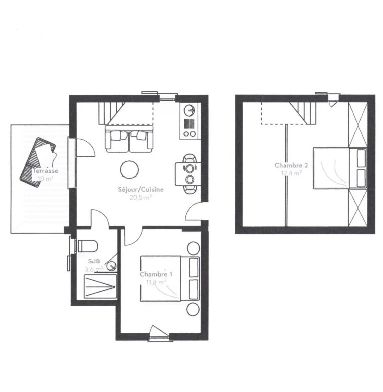 * 1 autre chambre (sans porte et donnant sur la pièce de vie) avec 2 lits séparables et une armoire de rangement en mezzanine, desservie par un escalier.