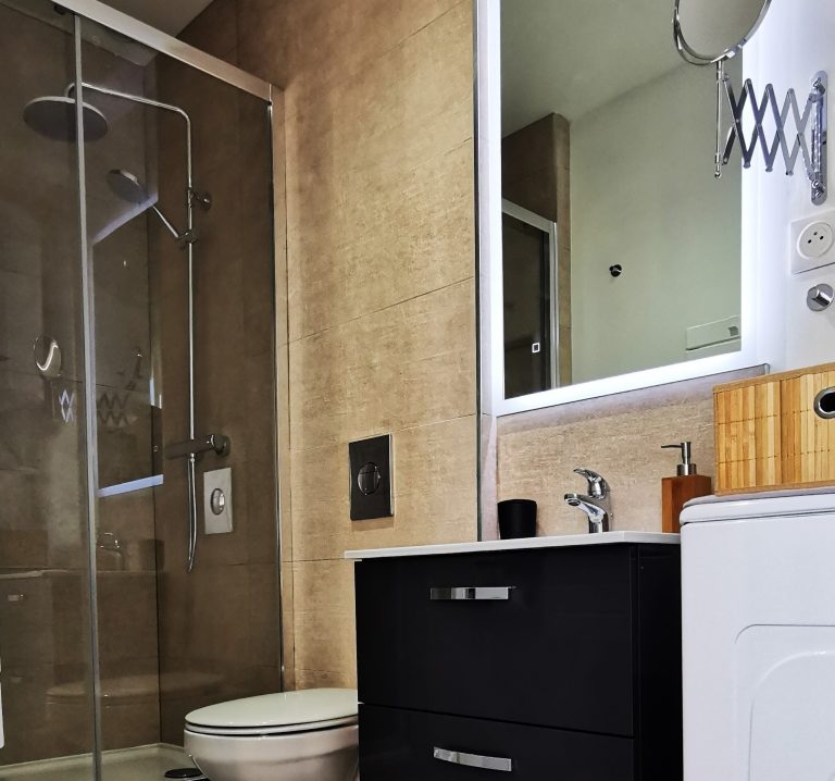 Déposez vos valises et accordez-vous un moment de détente sous une douche enveloppante à effet pluie dans une salle de bain aux tons chauds et à la décoration contemporaine.