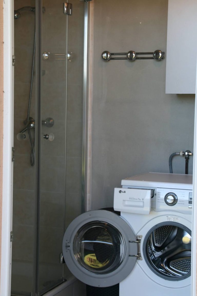 ✅ Espace buanderie extérieur avec machine à laver, séchoir et rangement