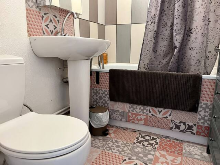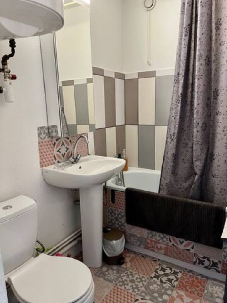 Entrée sur un couloir desservant la salle de bain avec petite baignoire et WC.