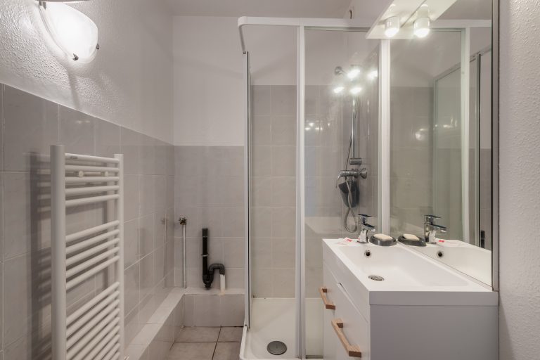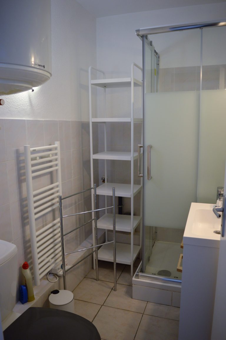 Entrée sur un couloir desservant la salle de douche avec WC.