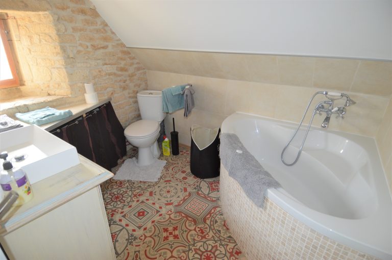 Salle de bain avec WC et baignoire d’angle sous pente (attention à la tête !)