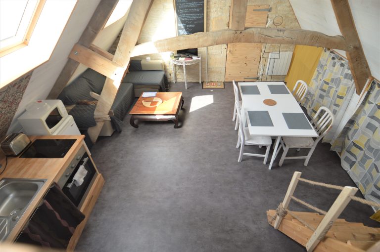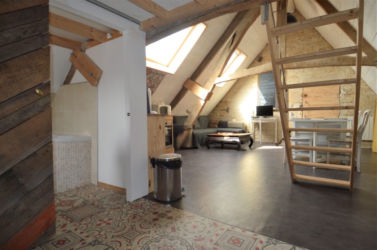 Ce studio atypique et moderne est récemment rénové dans les combles d’une maison en pierre de Caen. Il peut accueillir jusqu’à 4 personnes avec son lit en mezzanine et son canapé-lit (prévoyez les draps). Non loin de la plage vous serez au cœur de la ville de Luc-sur-Mer.