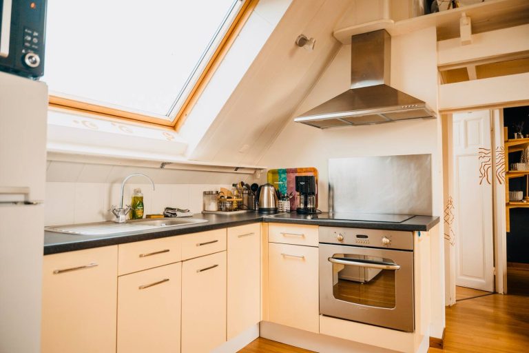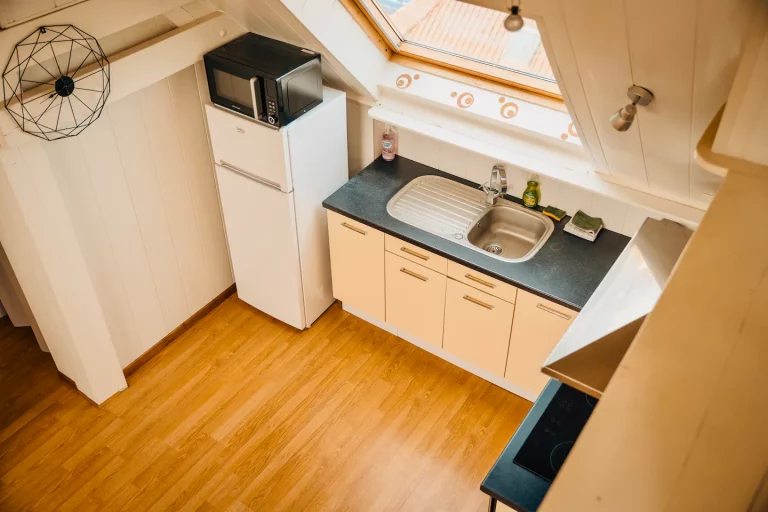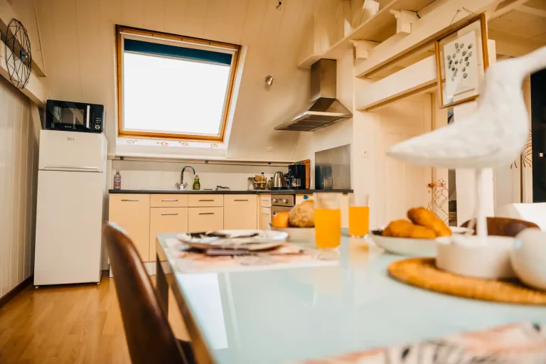 – une cuisine ouverte sur le salon séjour, équipée d’une table 4 personnes. La cuisine est équipée d’un regrigérateur, d’un four et d’un micro onde ainsi que de plaques de cuissons et d’un évier. Tout le nécessaire pour faire à manger (casserole, couvert, ustensile, assiettes ect… est inclus) vous avez également à votre disposition une cafetière filtre, d’une bouilloire, et nous vous offrons le café et le thé! 🙂