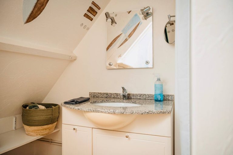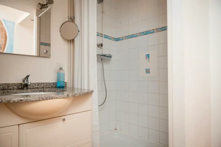 – une salle de bain avec douche et vasque simple