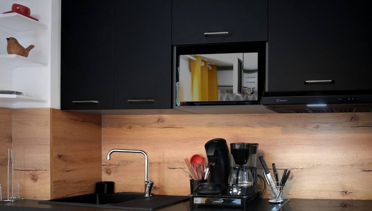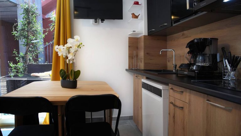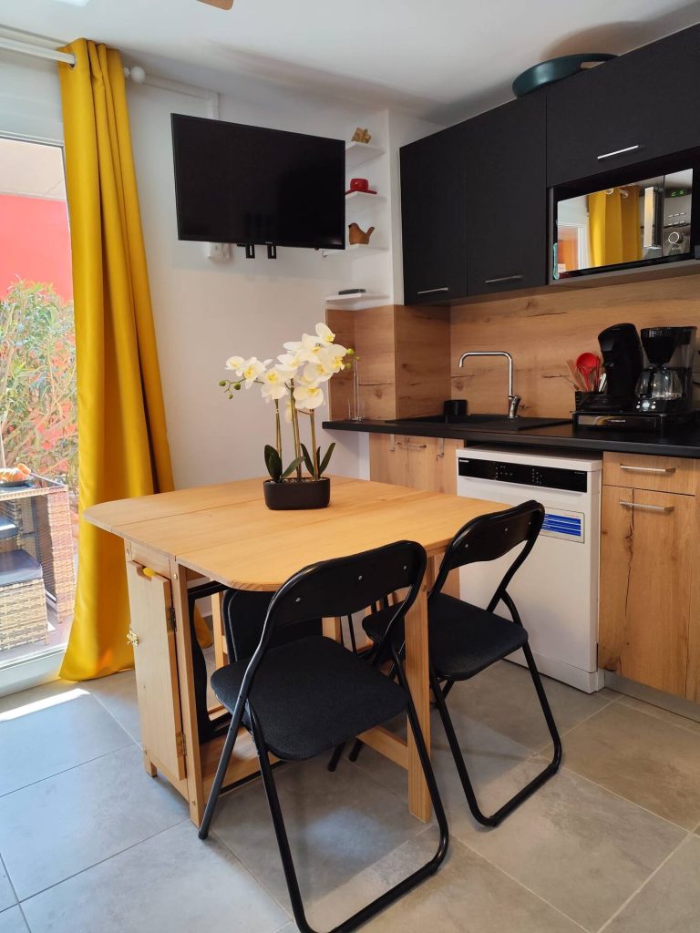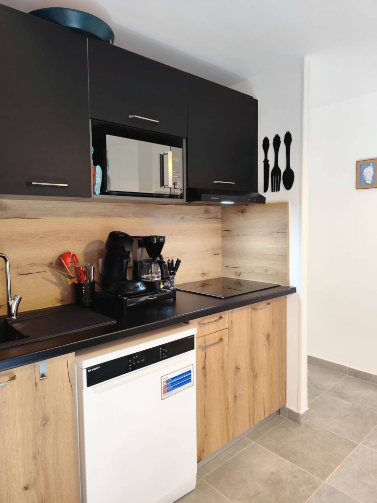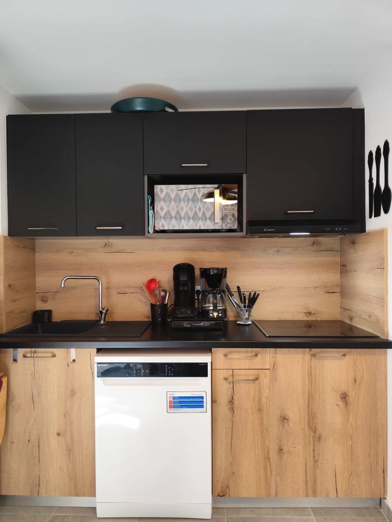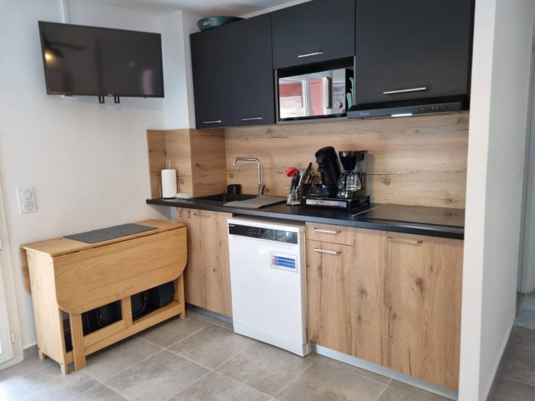 CUISINE ÉQUIPÉE avec lave-vaisselle, frigo, plaque de cuisson et micro-ondes.