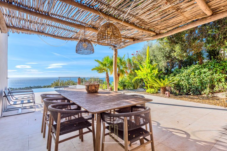 A l’extérieur, une terrasse s’étend sur toute la longueur de la maison, offrant un lieu idéal pour des repas en plein air ou pour se prélasser au soleil. Une piscine à débordement 9*4, donnant l’impression de se baigner dans l’horizon.
