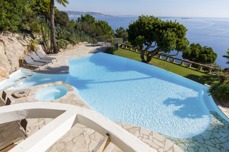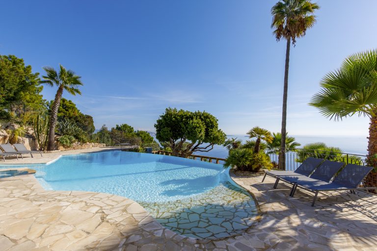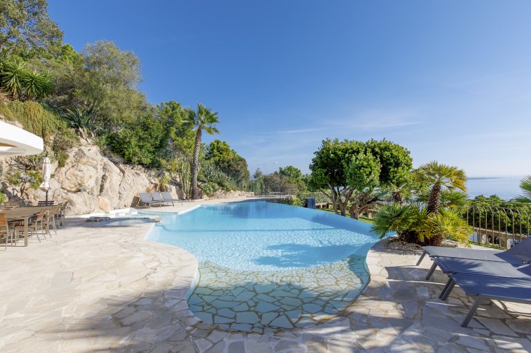 Une fois à l’intérieur de la propriété privée, vous serez agréablement surpris par son allure digne d’un film. Un large escalier plat mène à une vaste terrasse où se trouve une grande piscine à débordement chauffée de 12×8 mètres, sécurisée par une alarme d’eau et agrémentée d’un jacuzzi. Vous pourrez profiter du plein air dans toute sa splendeur, avec un pool house niché contre la paroi rocheuse, équipé d’un bar et d’un coin barbecue, offrant une expérience de luxe méditerranéen authentique.